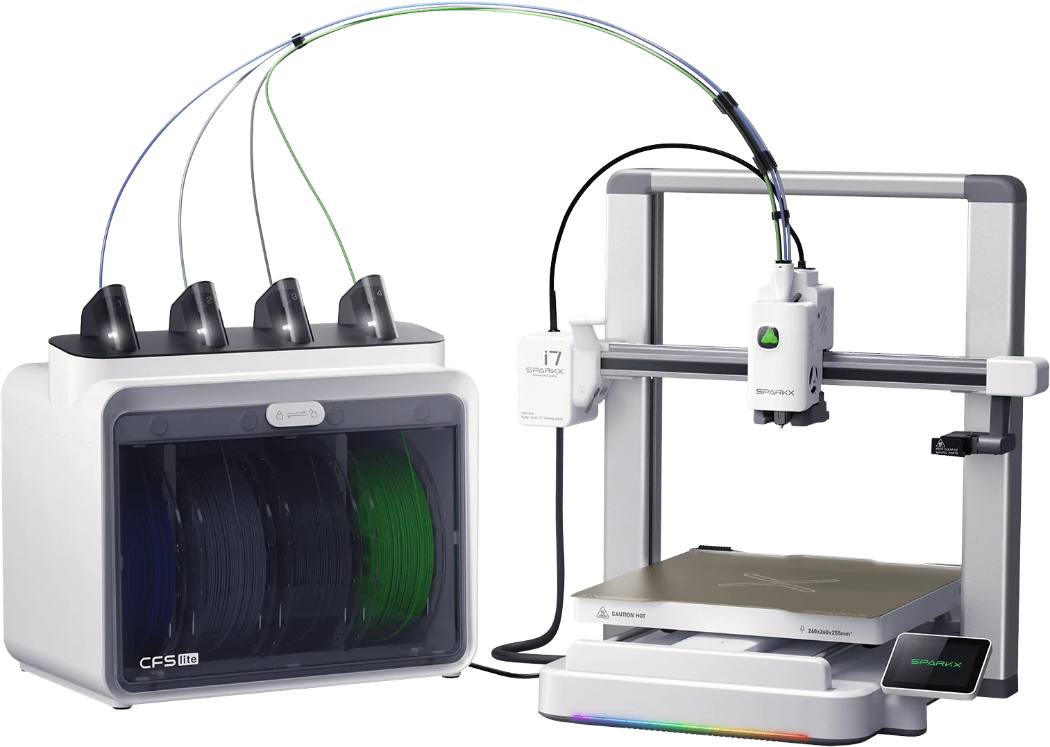 De Creality SPARKX i7 Combo is ontworpen voor handig en efficiënt meerkleurenprinten met maximaal vier kleuren. In combinatie met het CFS Lite-systeem maakt de printer een automatische kleurwisseling mogelijk, wat niet alleen tijd bespaart maar ook het materiaalverbruik aanzienlijk vermindert.