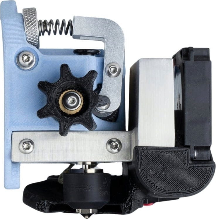 Koelvinnen zijn aan de zijkant van het koelblok geplaatst om het filamentpad zo kort mogelijk te maken. Dit kortere filamentpad zorgt ervoor dat de extruder sneller en preciezer reageert en dat er geen knikken ontstaan. De scherpe tanden van de twee aandrijfwielen grijpen het filament aan beide zijden bijzonder stevig vast en duwen het niet alleen soepel maar ook gelijkmatig in de hotend.